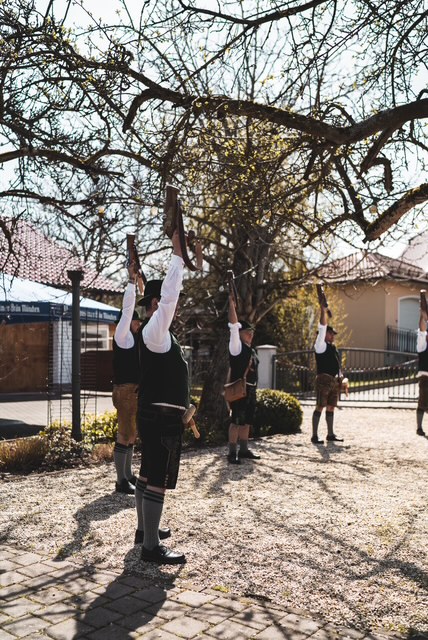 „Liebe Marion, lieber Josef, als Mitglied des KHV Jesenwang/Pfaffenhofen und als aktiver Böllerschütze bei den Böllerschützen des KHV wird es euch heute zu Teil, den dreifachen Ehrensalut eures Hochzeitstages zu erhalten. Bei Hochzeiten, Taufen oder besonderen Anlässen wird stets die Zahl „Drei“ verwendet, wie es sonst auch bei der Salve (Salut genannt) der Fall ist. Das dreimalige Böllern verkörpert bei Eurer Hochzeit: …das Abgeschlossene, …das Vollendete, … das Vollständige“